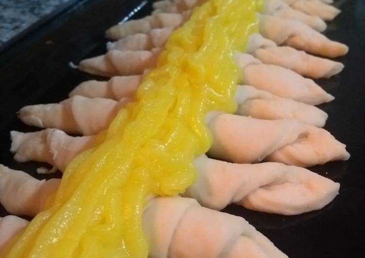 - Si quieren le dan forma de una media luna o sino, la dejan estiradita así y le presionan las puntas. Una vez armadas las dejan descansar hasta que dupliquen su tamaño. Le pueden colocar crema pastelera con una manga y queda riquísimo! También pueden colocarle la crema después de que las saquen del horno. La bandeja solo tiene que tener aceite o manteca..