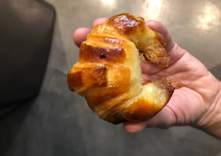 - Estiramos en un rectángulo de 24 por 40 o 50 y ese rectángulo lo cortamos a la mitad, superponemos las partes y cortamos en triángulos, separamos y heladera de nuevo, psado 15 min ovillamos los triángulos tal como la foto y disponemos en placa enmantecada dándole forma de medialuna.